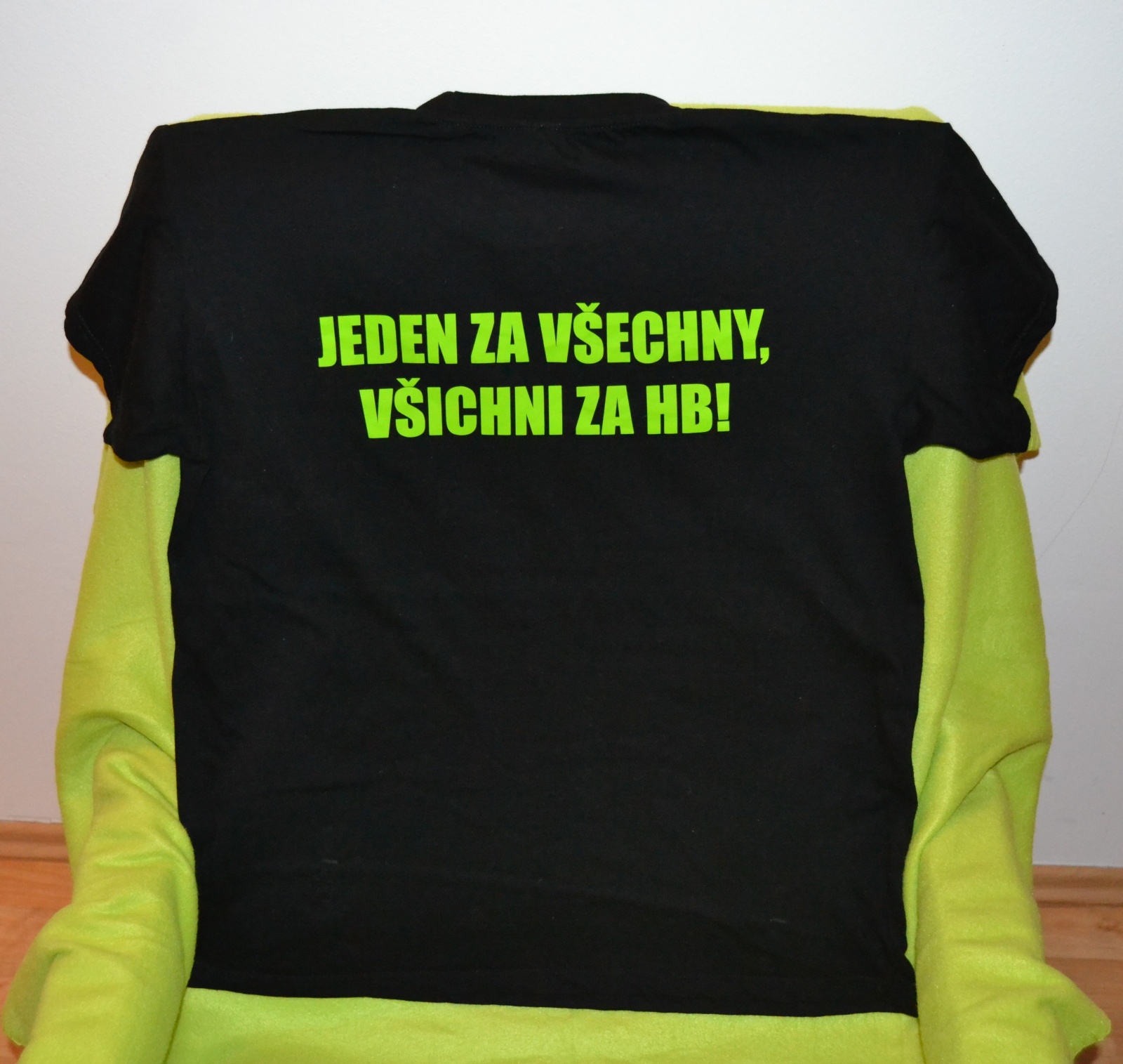 Černé tričko, vpředu logo, na zádech nápis "jeden za všechny, všichni za HB".